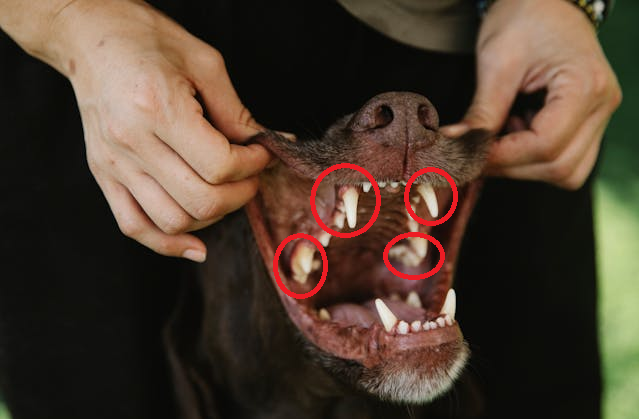また、ブラシを口に入れて磨けるようになったら、犬の歯の歯垢が溜まりやすいポイントをしっておくと、効率のいい歯磨きをすることができます。以下の写真の赤い丸で囲った部分を確認してみてください。